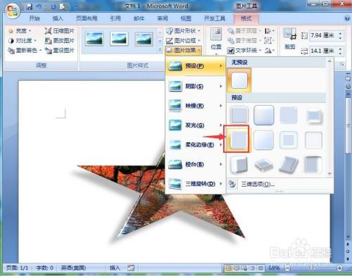 点击格局,选择图片外形,在星与旗号中点击五角星;