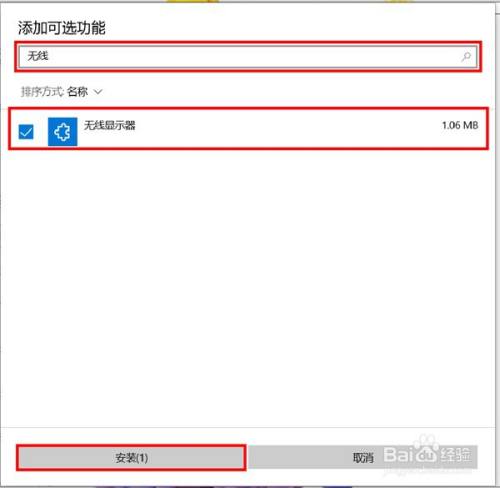 点击添加功能,在添加可选功能搜索框中输入无线,在搜刮成果中勾选无线显示器,点击安装。