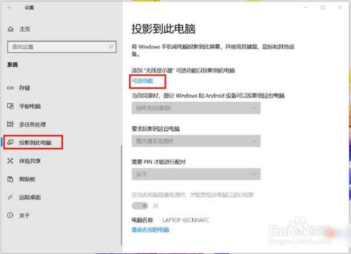 连接网络状况下,在Windows设置界面选择系统,点击投影到此电脑,选择可选功能。