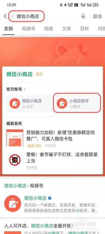 随后在搜刮成果中点击【小商铺助手】小程序,进入微信小商铺中;