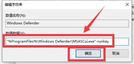双击后打开该字符串的编纂窗口,在窗口中把数值数据点窜为"%ProgramFiles%\Windows Defender\MSASCui.exe"-runkey,最后点击“确定”按钮。从头启动计较机后,可以发现Windows Defender的图标已显示出来了。