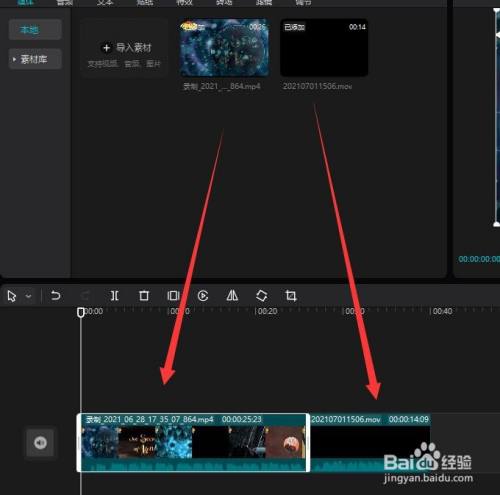 如图所示,我们将两个视频别离拖动到对应的视频轨道上,并放置到分歧的位置。