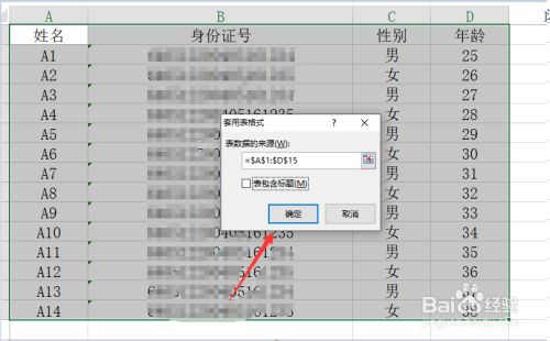 当弹出如图所示的套用表格样式洁面后,我们选择响应的数据区域之后,点击确定按钮。