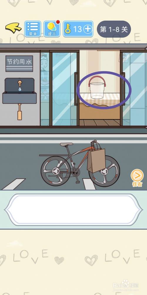 进入左侧场景,打开玻璃门,拿到一只【水桶】。