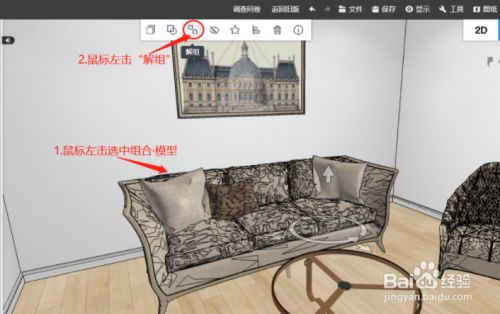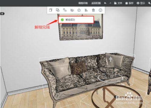 鼠标左击选中组合模子后,然后鼠标左击“解组”(注:也可按快捷键Ctrl+B解组)。