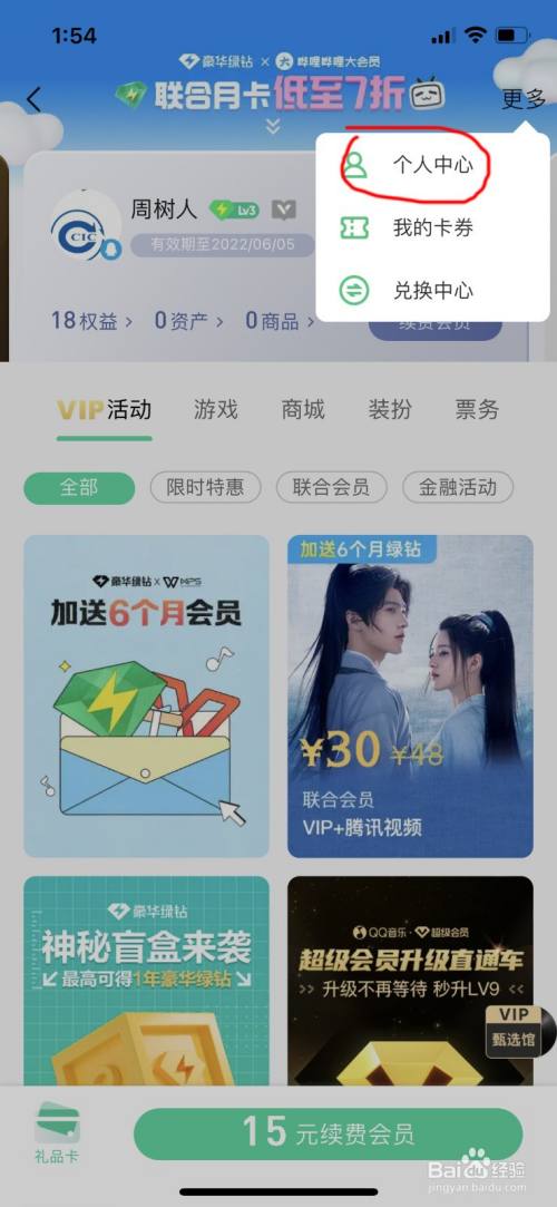 进入会员中间之后,您点击右上角的“更多”如图;然后点击“小我中间”