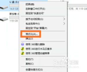 右键点击U盘,找到弹出菜单中的格局化选项。