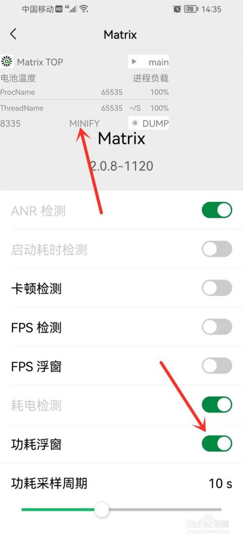 进入机能检测东西,打开“功耗浮窗”开关,点击浮窗上面“MINIFY”。