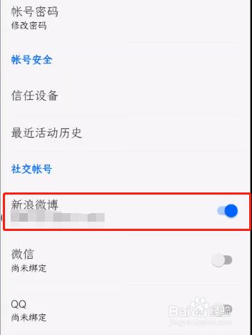 打开如下图界面,滑脱手机屏幕,选择下方的新浪微博账号,点击封闭后面的开关。