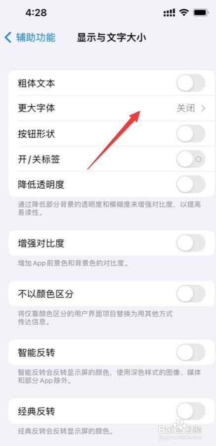 点击“更大的辅助功能字体”后面的灰色按钮