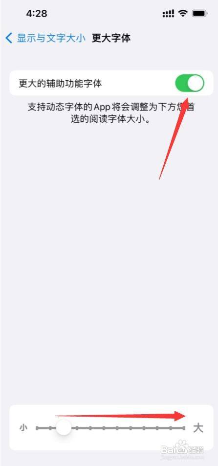 开启变为绿色按钮,拖动下面的字体滑条标的目的右即可调整放大字体了