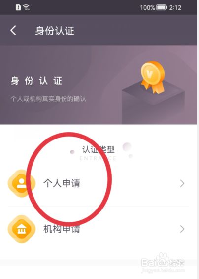 在【keep认证】页面,点击【身份认证】按钮,然后点击【小我申请】按钮。