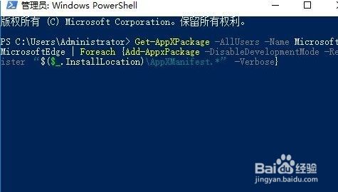 在打开的Windows PowerShell窗口中输入号令Get-AppXPackage -AllUsers -Name Microsoft.MicrosoftEdge | Foreach {Add-AppxPackage -DisableDevelopmentMode -Register “$($_.InstallLocation)\AppXManifest.*” -Verbose}