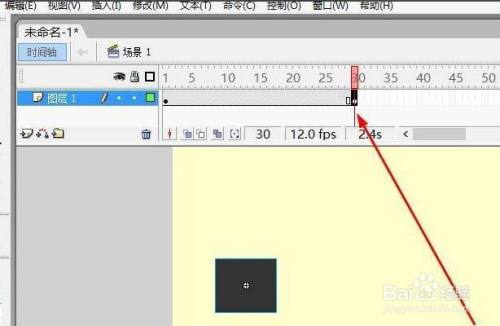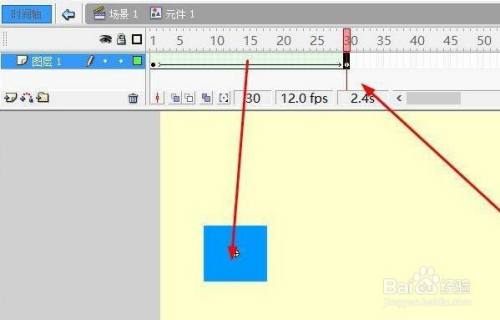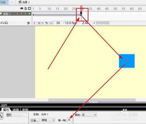 第九步,回到本家儿场景,在第30帧选择元件,设置元件属性如图,这样就建造好了元件移动并变色的动画结果.