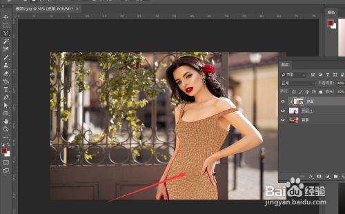 如下图所示,我们可以看到人像的衣服发生了变换,酿成了皮革的颜色和材质。我们也可以将图层夹杂模式改为【正片叠底】,稍稍降低图层不透明度,这样衣服的材质就会闪现为皮革。