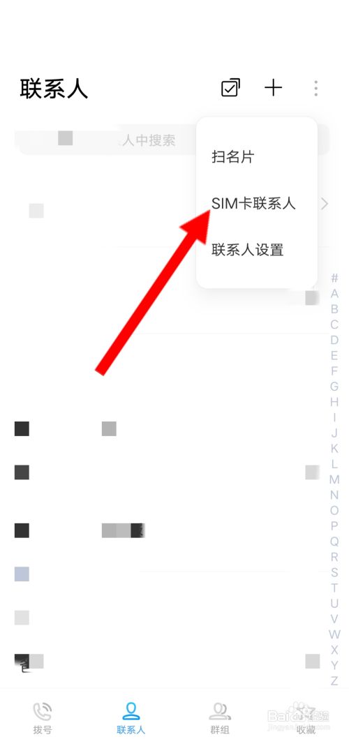 进入手机联系人,然后点击右上角三点图标,然后点击SIM卡联系人。
