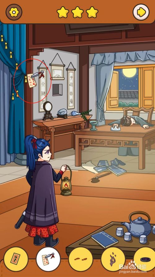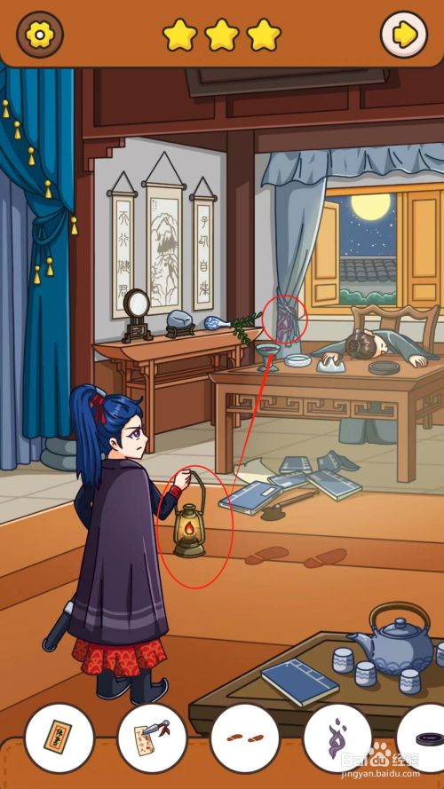 第一步:找到”毒烟“;将女侠手上的火油灯点亮桌上的烛台,油灯燃烧后就能生当作毒烟。