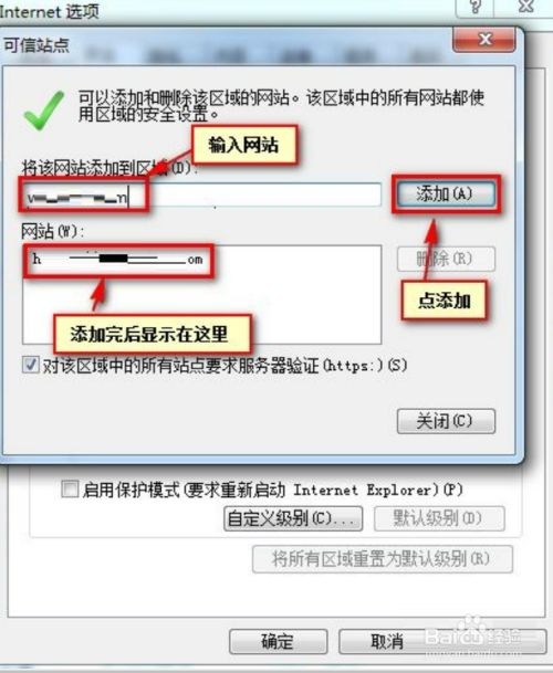 第五步:在弹出的可托站点窗口的输入框中输入想要添加的网站,然后点击右侧的【添加】按键,网站就被添加到下方的显示框中,最后点击【封闭】返回Internet选项窗口(如图所示)。