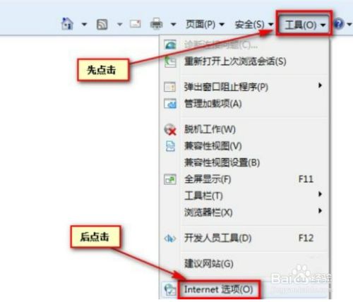第二步:点击浏览器界面右上角的东西,在弹出的下拉菜单中点击最下面一项“Internet选项”(如图所示)。