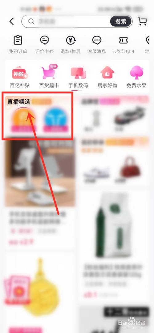 进入抖音商城首页,点击顶部“直播精选”。