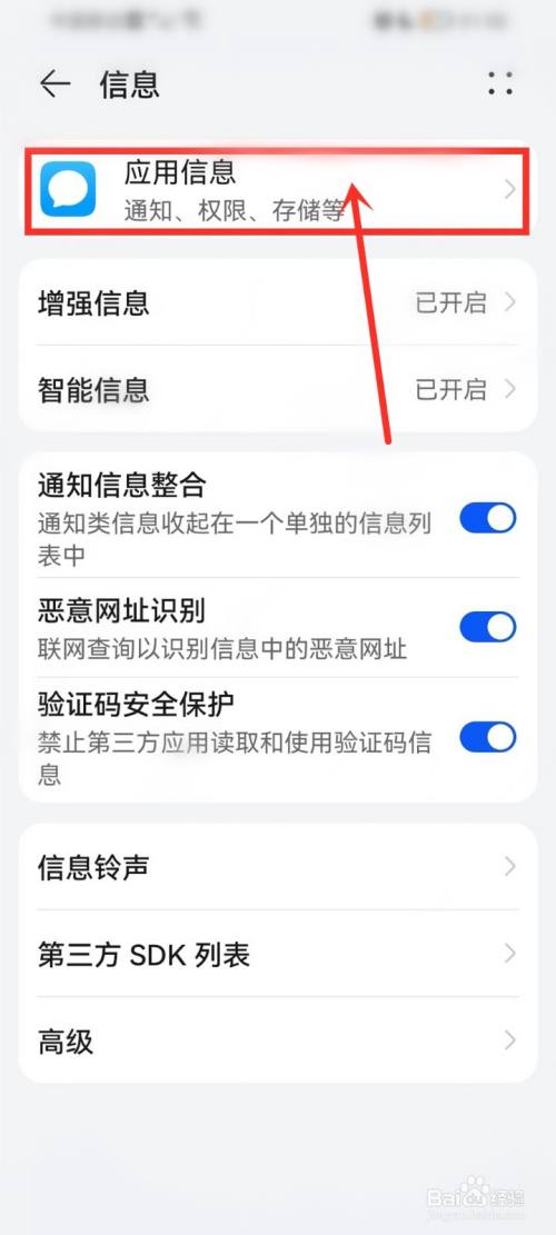 在应用和办事设置中找到“信息”选项,点击进入。
