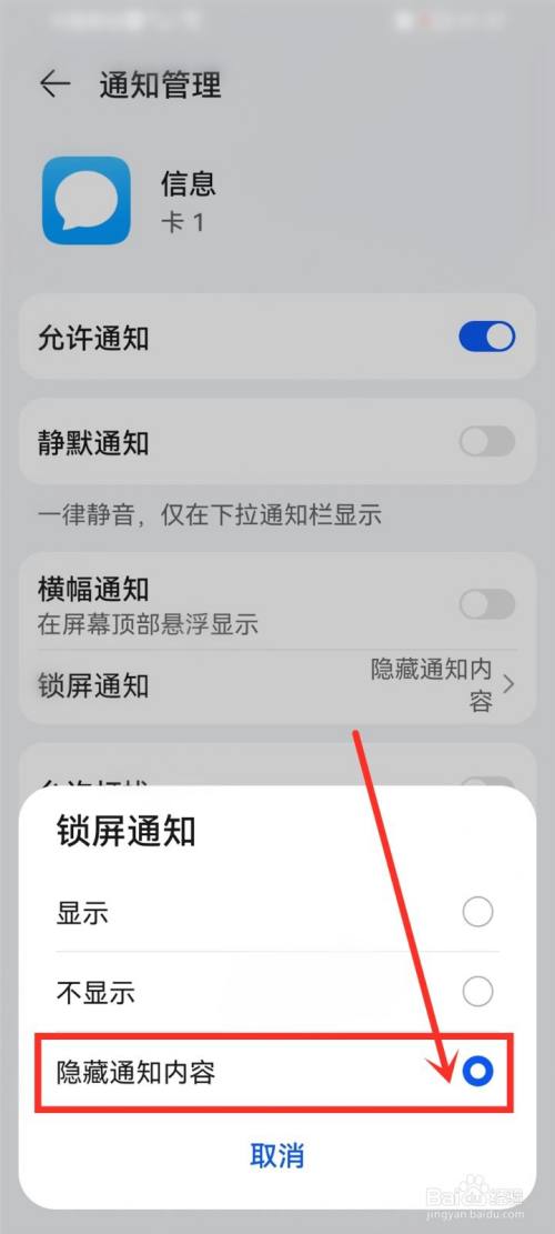 进入锁屏通知设置,选择“埋没通知内容”,即可设置设置短信锁屏不显示。