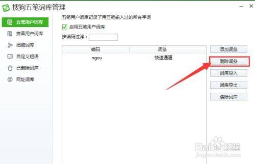 如下图所示。 我们进入“五笔用户词库”后,点击【删除词条】进入页面。