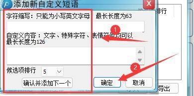 在弹出窗口中,设置“字符缩写、自界说内容、候选项排行”等参数,点击“确定”