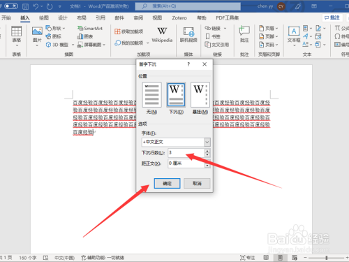 在首字下沉设置选择需要下沉的行数,点击【确定】即可。