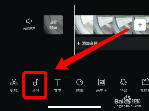 进入视频剪辑界面,点击“音频”功能。