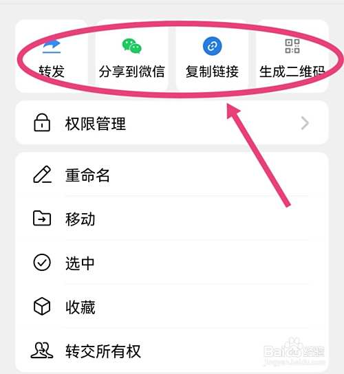 在弹出窗口中设置权限,再点击分享到微信可把企业微盘的文件导出到微信页面。