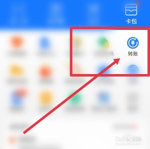 打开手机支付宝,在支付宝首页点击转账菜单。