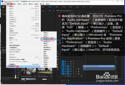 确保麦克风已准确设置,而且已在 Premiere Pro 的“Audio Hardware”(音频硬件)首选项中被选为“Default Input”(默认输入)设备。选择“Edit”(编纂)>“Preferences”(首选项)>“Audio Hardware”(音频硬件)>“Default Input”(默认输入)(Windows) 或 “Premiere Pro Application”(Premiere Pro 应用)菜单 >“Preferences”(首选项)>“Audio Hardware”(音频硬件)>“Default Input”(默认输入)(macOS),拜候该首选项。