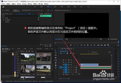 新的音频剪辑将显示在序列和“Project”(项目)面板中。新的声音文件默认将显示在与项目文件不异的位置。