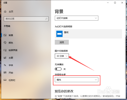 点击“图片切换频率”下拉列表,从中选择桌面壁纸切换的时候距离。