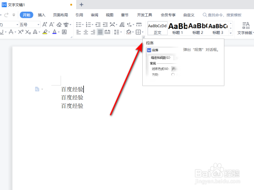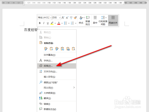 将鼠标逗留在题目处,右键鼠标点击【段落】,或在段落菜单栏中点击箭头符号。