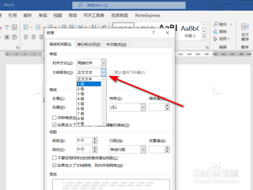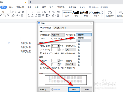在打开的段落设置中选择分歧题目的纲领级别,点击【确定】。