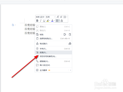 选择题目,右键鼠标点击【段落】选项或者点击段落窗口中的快捷键。