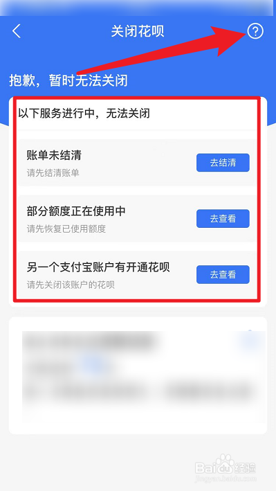 如下截图,即可查看您当前要封闭花呗需要的前提。点击右上角的问号标识。