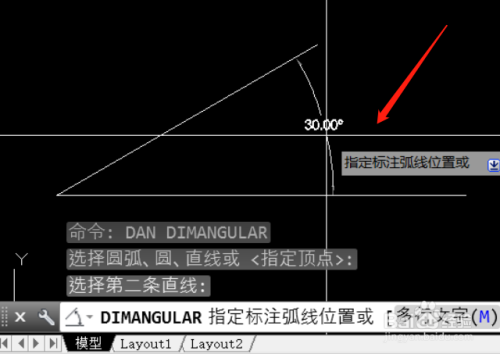 指定尺寸线标注的位置,即可完当作角度测量。