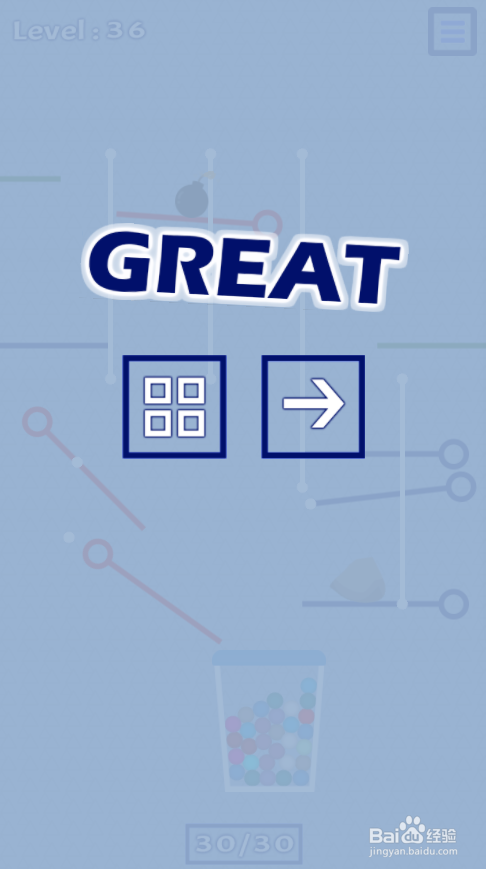 彩色小球全数落入底部的桶里,弹出GREAT的通关画面,这样就过关了。