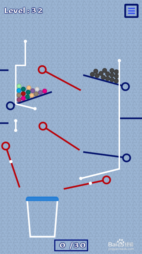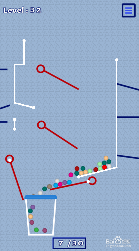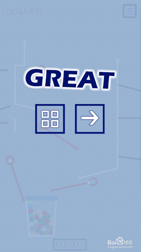 彩色小球全数落入底部的桶里,弹出GREAT的通关画面,这样就过关了。