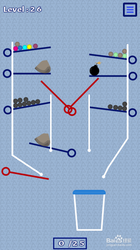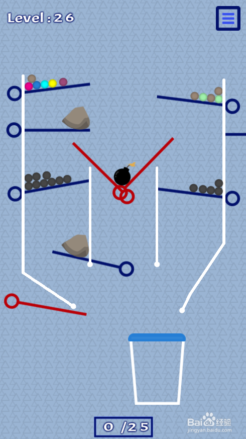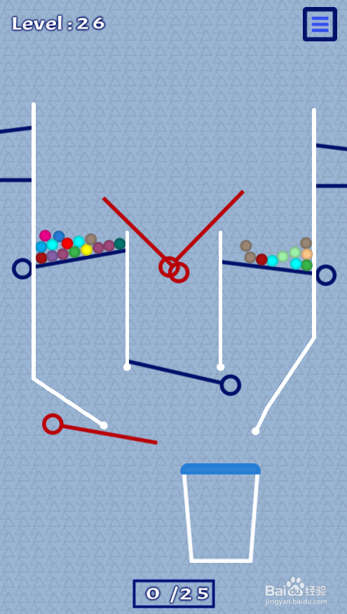 彩色小球全数落入底部的桶里,弹出GREAT的通关画面,这样就过关了。
