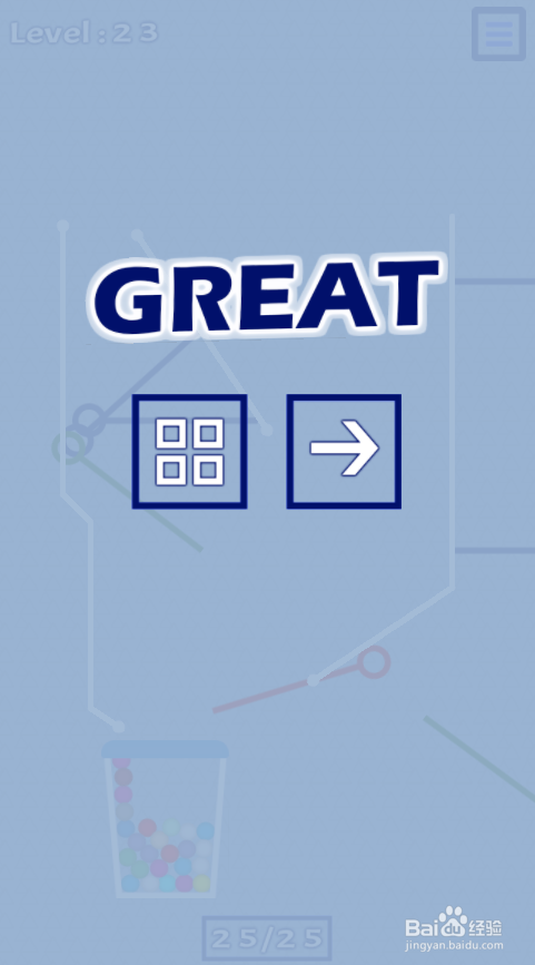 彩色小球全数落入底部的桶里,弹出GREAT的通关画面,这样就过关了。