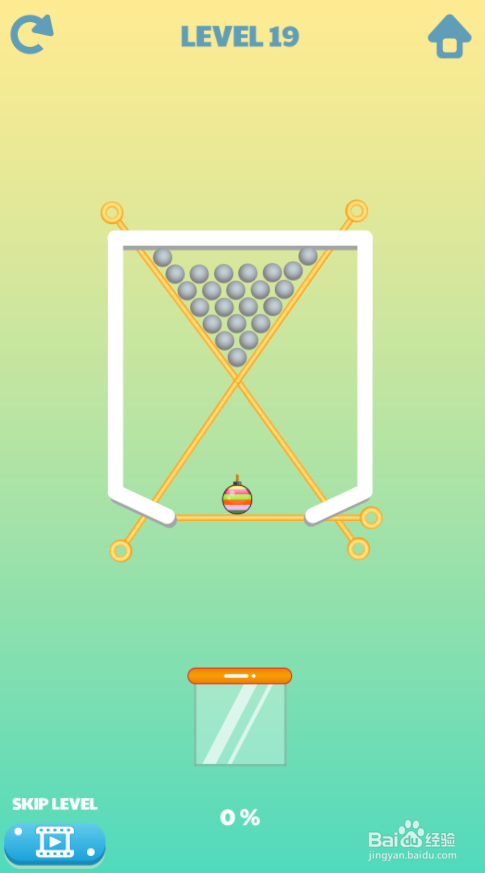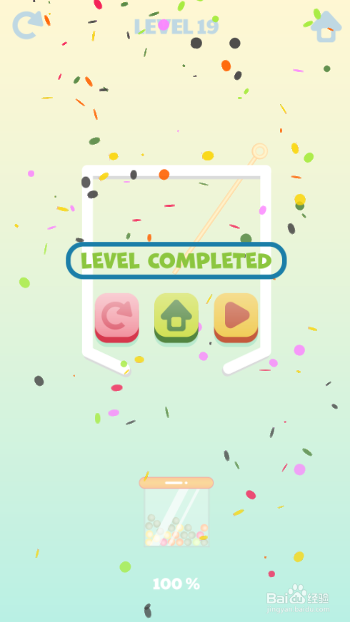 点击拔失落彩色小球下面的横标的目的拉针,彩色小球全数落入容器中,弹出LEVEL COMPLETED的画面,如图,这样就过关了。