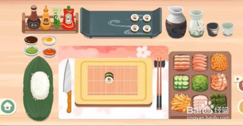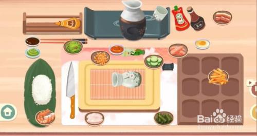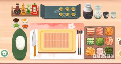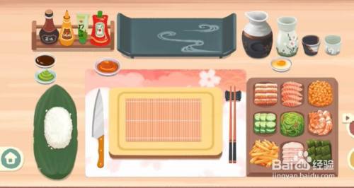 7、最后我们在寿司里加上鱼子酱和海草,酱油和芥末放到盘子上即可过关。