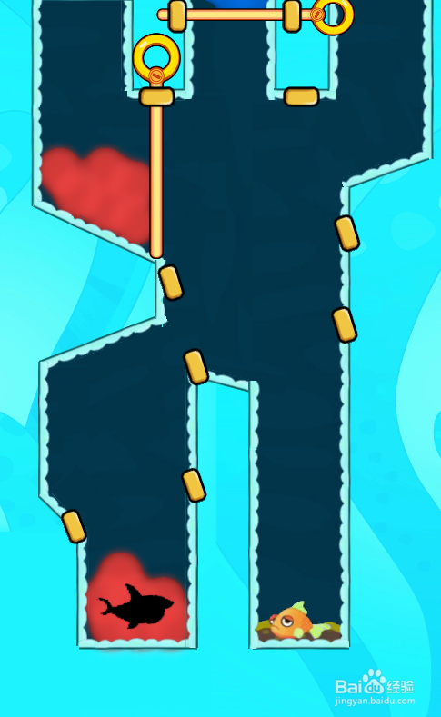 这一关有两组红色熔岩,有六个拉针,环境如图。