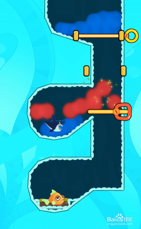 这一关添加了鲨鱼,有两个拉针与一个推拉杆,环境如图。