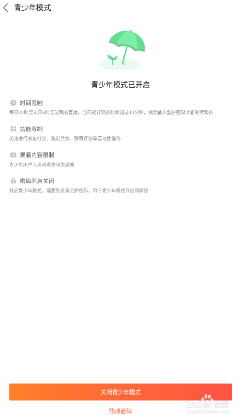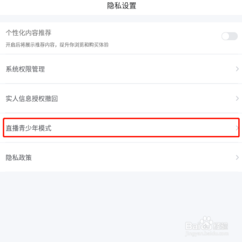 打开如下图界面,选择直播青少年模式选项,点击打开
