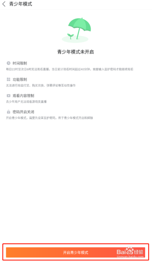 打开如下图界面,点击界面下方的开启青少年模式按钮